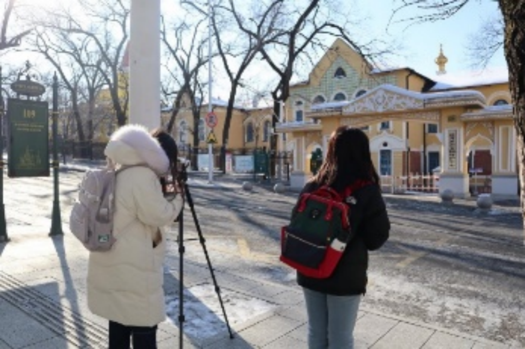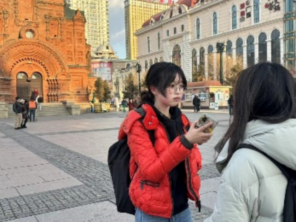 其中,一个小组的成员们实地走访了中央大街、松花江冰雪嘉年华、红专街早市和冰雪大世界等热门旅游景点,观察现场的基本情况,切身感受景点的服务、现场的调度和游客热情,这次现场的实地走访为小组成员后期的现场采访提供采访素材,也让小组的成员们真切的感受到了“人间烟火气,最抚凡人心”。