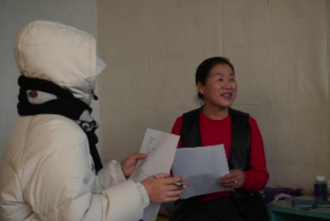 宋佳欣、席英铭、马雯姝正在对村老年人医疗保障问题进行调研